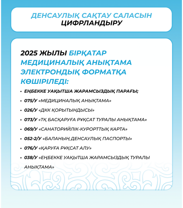 Өзгерістер басқа медициналық құжаттардың берілуіне де әсер етті. Сондай-ақ азаматтарға ыңғайлы болу үшін қағаз түрінен электронды форматқа көшіру жоспарланып отыр: