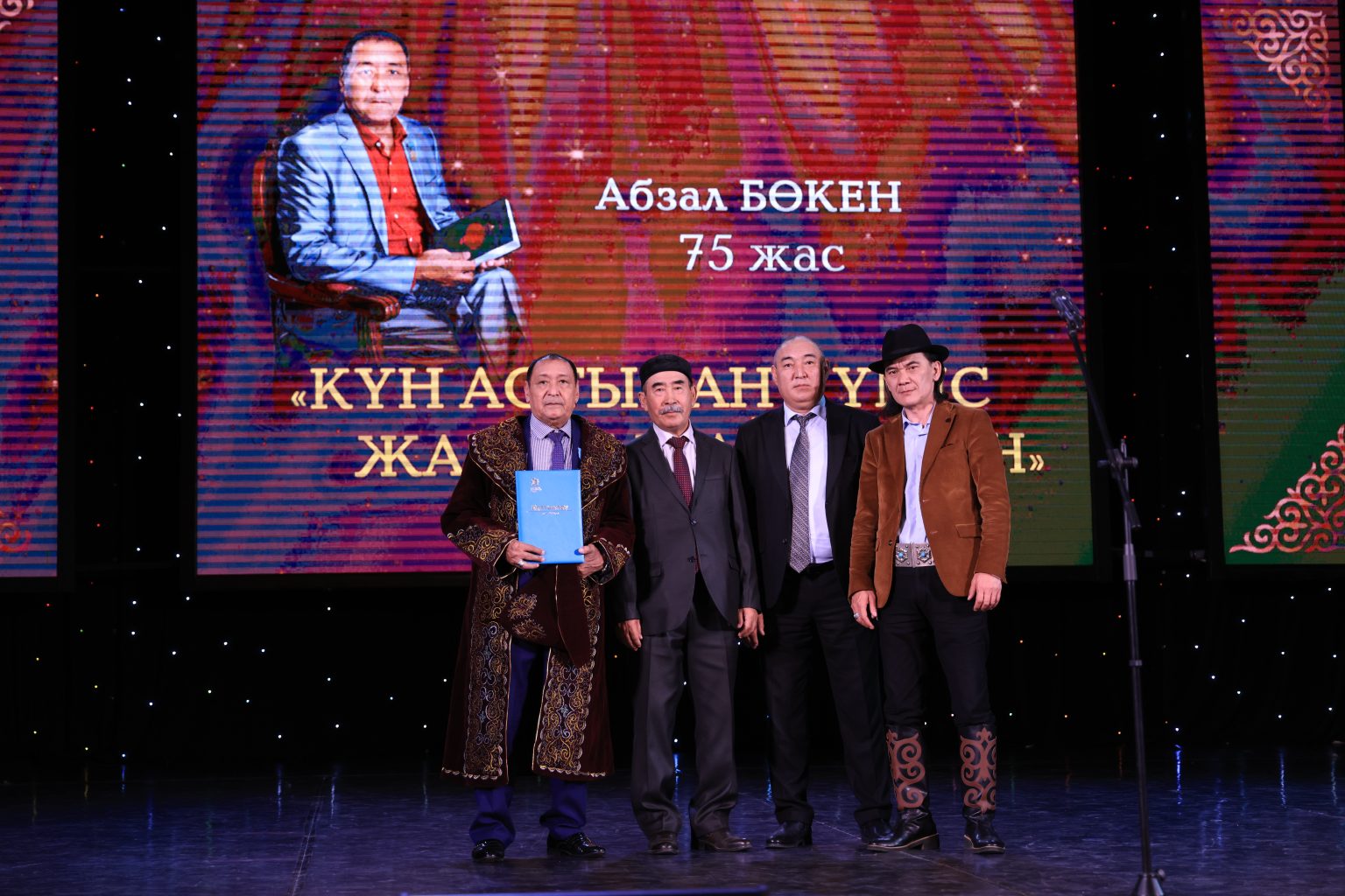 – Мынау еліме келіп, 75 жасқа толғанымды туған жерім, елім, өңірім қарсы алып жатыр. Көңіл-күйім көтеріңкі. Бұл жасқа біреу жеткен, біреу жетпеген. Аллаға тәубе дейміз, 75 – үлкен, ұзақ ғұмыр ғой. Өмір бойы шығармашылықпен айналыстық. Шығармашылығыма келетін болсақ, кейінгі жылдары «Тәж», «Тақ», «Төр» деген қалың-қалың поэзиялық шығармаларым жарық көрді. Өзімді бақытты сезінемін. Халқыммен кездесіп жатырмын, ағайын-жұртыммен сөйлесіп жатырмын. Қазақстан Республикасы Парламенті Мәжілісінің депутаты, ақын, тіл жанашыры Қазыбек Иса Алаштың алтын медалімен марапаттады. Ағайын-жұртыма алғыстан басқа айтарым жоқ, – деп атап өтті кеш кейіпкері, «Алаш» әдеби сыйлығының лауреаты, ақын Абзал Бөкен.