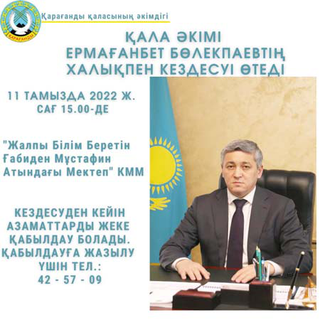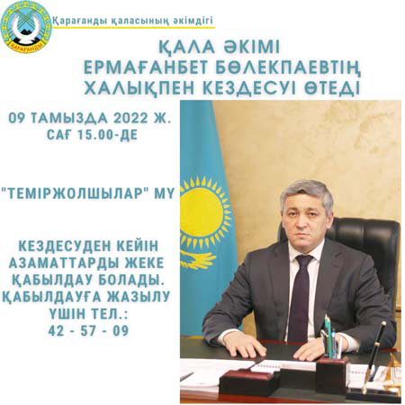 Осы орайда Қарағанды қаласының әкімі Ермағанбет Бөлекпаев 9 және 11 тамызда халықпен кездесу өткізетінін хабарлаймыз.