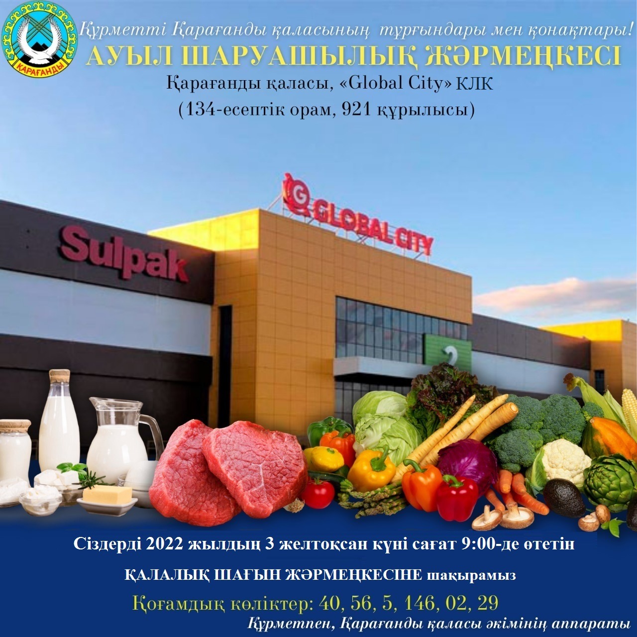 Бұған дейін қаламыздағы «Global City» сауда үйінің аумағында облыстық деңгейде ауылшаруашылық жәрмеңкелері ұйымдастырылып келген еді. Алдағы жексенбіде, яғни 3 желтоқсан күні, қалалық шағын ауылшаруашылық жәрмеңкесі өтпек.