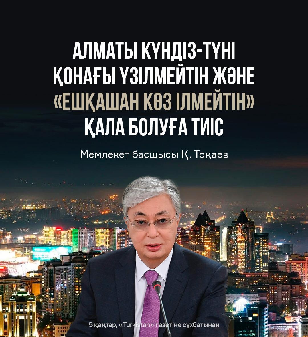 Алматы – еліміздің мәдени, экономикалық және туристік орталығы. Қалаға жыл он екі ай туристердің ағылып келуі, түнгі өмірдің жанданып, қауіпсіз әрі қолайлы инфрақұрылымның қалыптасуы – оның әлемдік деңгейдегі мегаполиске айналуына жол ашады. Күндіз іскерлік пен мәдени шаралар, кешке өнер мен демалыс орындары, ал түнде тыныштық пен қауіпсіздік қатар үйлескенде ғана қала шын мәнінде «ұйықтамайтын» қалаға айналады. Бұл мақсатқа жету үшін қоғамдық көлік, жарықтандыру, қызмет көрсету саласы, қауіпсіздік жүйесі үздіксіз жұмыс істеуі керек. Сонда Алматы тек Қазақстанның ғана емес, бүкіл Орталық Азияның тартымды, заманауи әрі қонақжай мегаполисі бола алады.
