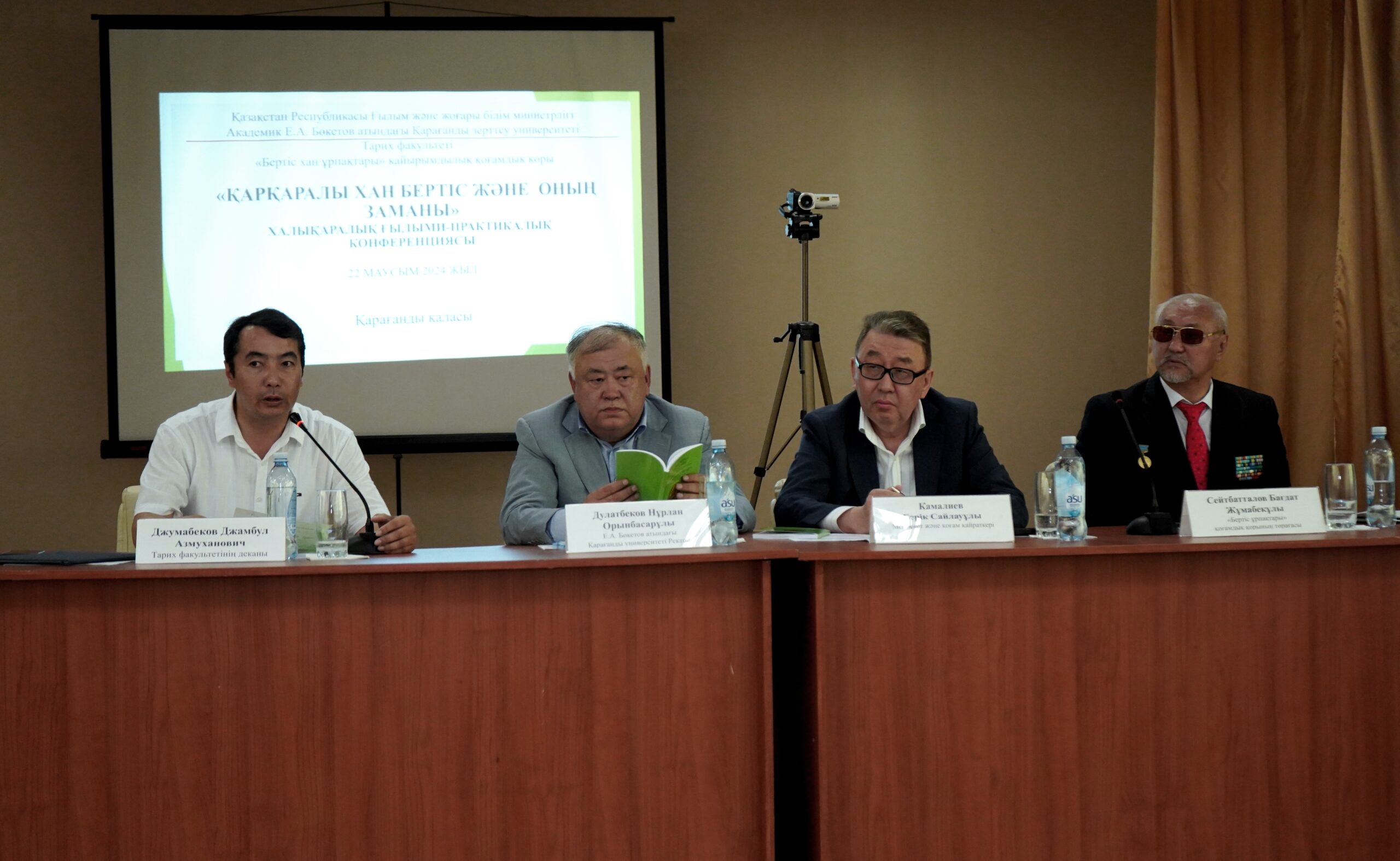 – Бүгінгі күнде іске асырылып жатқан мәдени-рухани шаралардың басты міндеті – халқымыздың бай тарихы мен дәстүрін насихаттап, әлемдік өркениеттің көшінде өзіміздің ұлттық реңкімізбен нық орнығу екенін барлығымыз білуіміз керек. Себебі тарихи жады мен мәдениеті биік қоғамда мемлекеттік идеологияның іргетасы да берік болады. Осы орайда өткен тарихымыздың қатпарлы беттерінің құпиялары және ата-бабаларымыздың үлгі-өнеге көрсетіп кеткен ғибратты ғұмыры туралы ғылыми-зерттеулерді жариялай берудің тәрбиелік құндылығы жоғары болмақ. XVII ғасырдың ортасы мен XVIII ғасырдың басында өмір сүрген кемеңгер би, қоғам және мемлекет қайраткері, сол дәуірде өмір сүрген замандастары арасында «Қарқаралы хан Бертіс» атанған Бертіс бидің тұлғалық өміріне арналып отырған ғылыми-практикалық конференцияның атқаратын жүгі де салмақты. Тарих дегеніміз – халықтың жады, зердесі. Сол өткен қасиетті тарихымызды қайта тірілтіп, өскелең жас ұрпақ пен зерделі қауымға даңқты тұлғаларының есімін қайта жаңғыртып насихаттау бәріміздің парызымыз болмақ, – деп атап өтті академик Е.А.Бөкетов атындағы Қарағанды зерттеу университетінің Басқарма төрағасы – Ректор, ҚР ҰҒА корреспондент-мүшесі, заң ғылымдарының докторы, профессор Нұрлан Дулатбеков.