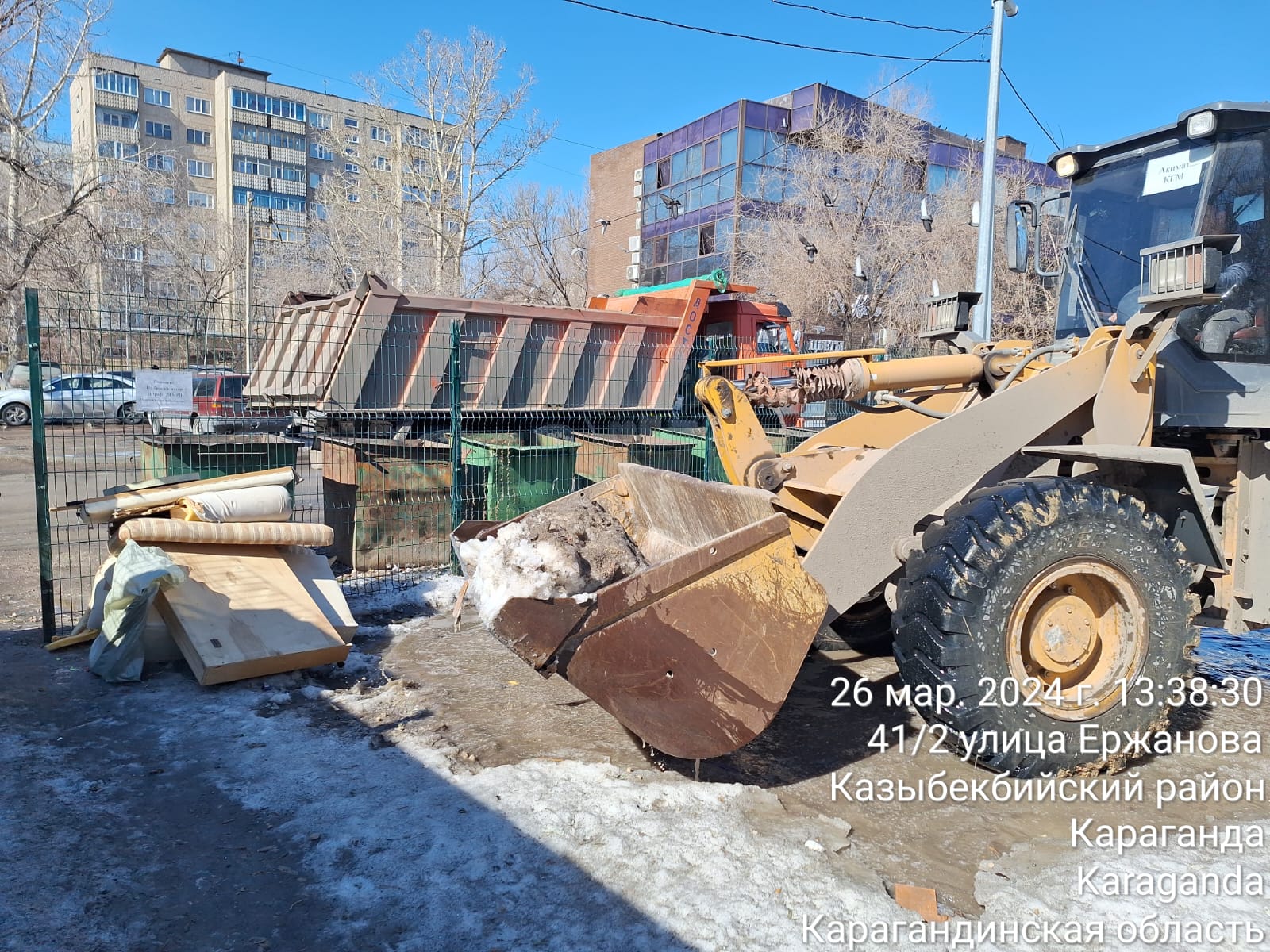 Қазыбек би атындағы аудан әкімдігінің ақпаратынша, «Елді мекендердің санитарлық тазалығын қамтамасыз ету» бағдарламасын іске асыру шеңберінде Қарағанды қаласы Қазыбек би атындағы аудан әкімінің аппараты мен «Itera KRG» ЖШС және «Ер Агро» ЖШС (орындаушы) арасында қаланың және Оңтүстік-Шығыс секторларының кварталішілік кірме жолдарын, тұрғын үй массивтерін күтіп ұстау жөнінде шарт жасалған. Мердігерлер келісімшарт аясында күн сайын ірі қалдықтарды шығару жұмыстарын жүргізеді, жұмыстарға 4 тиегіш және 8 самосвал техникасы жұмылдырылған.