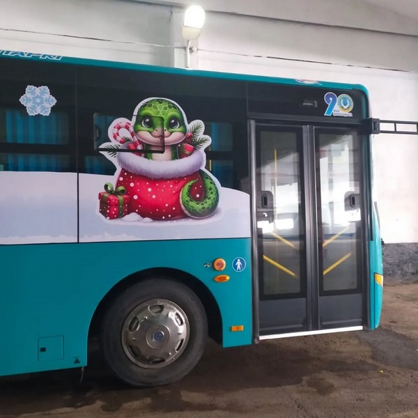 Көліктерде келе жатқан 2025 жылдың символы – жыланның бейнесі, шырша, сыйлықтар, қар бүршігі бейнеленген жапсырмалармен безендірілген.