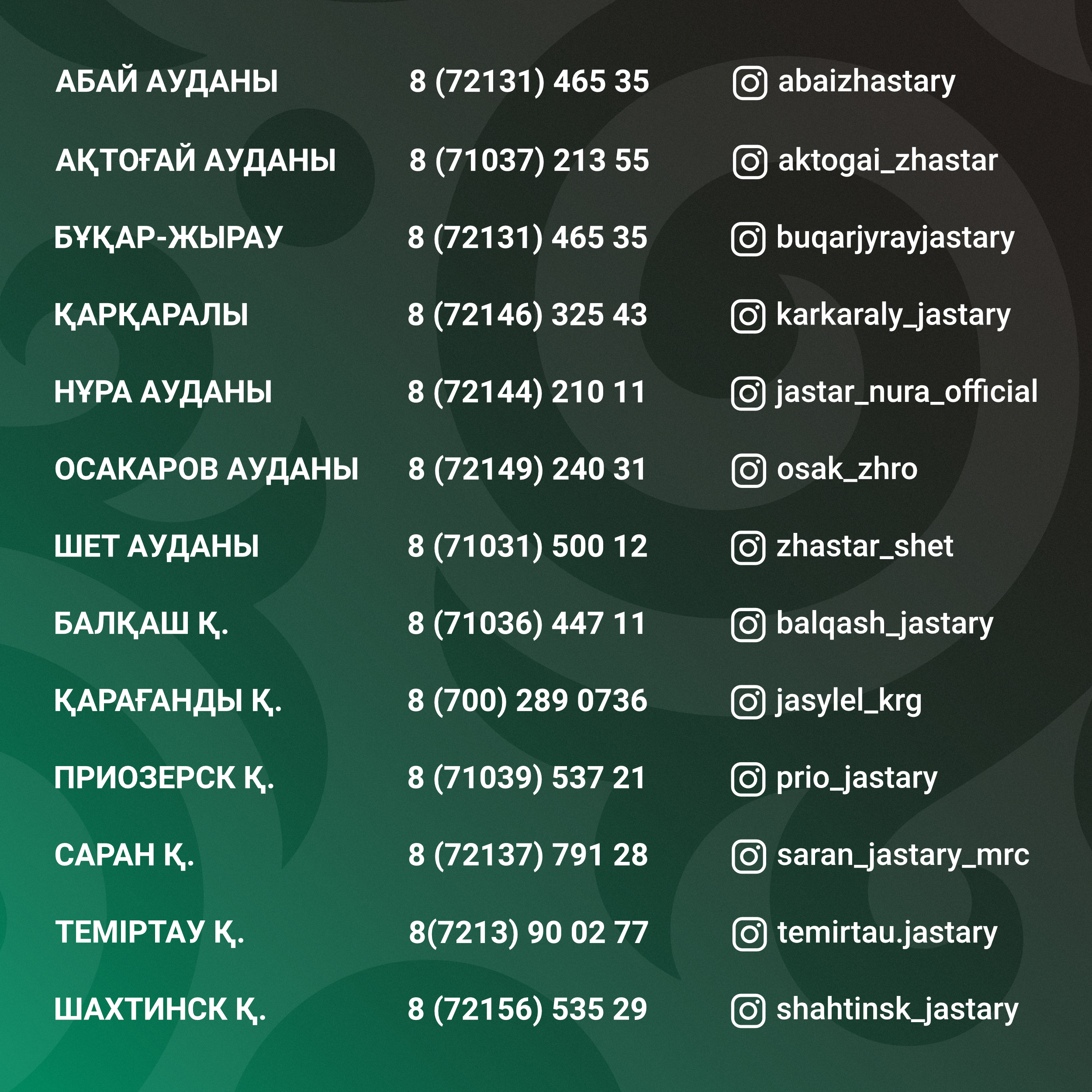 Жастар ресурстық орталықтарының мекенжайлары: