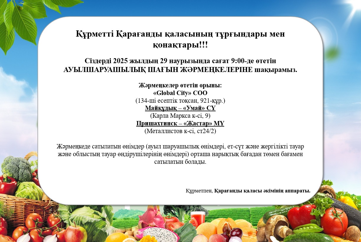 Сенбі, 29 наурыз Қарағанды қаласында шағын ауылшаруашылық жәрмеңкелері өтеді. Сауданың басталуы сағат 9:00-де.