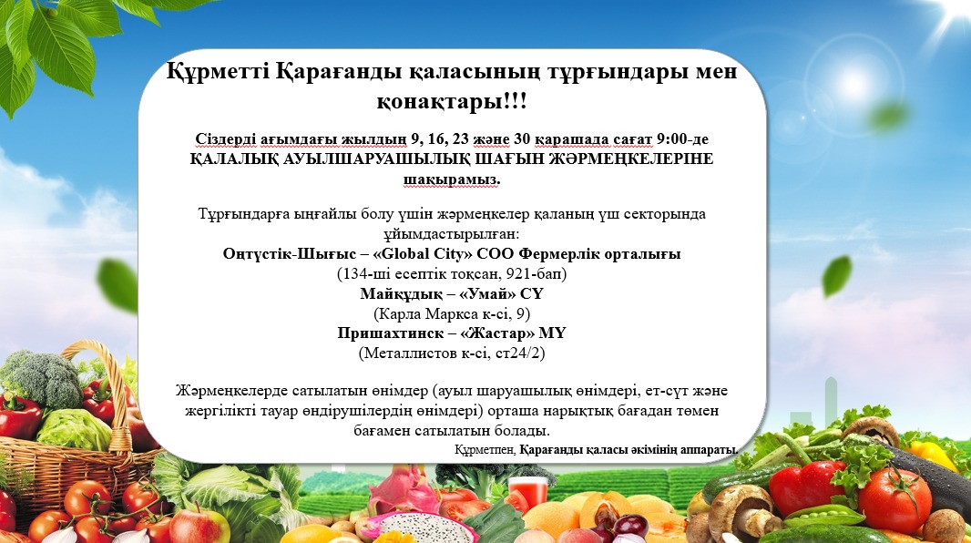 Сіздерді 9, 16, 23 және 30 қарашада қалалық ауылшарушалық шағын жәрмеңкелеріне шақырамыз. Сауданың басталуы – 09:00.