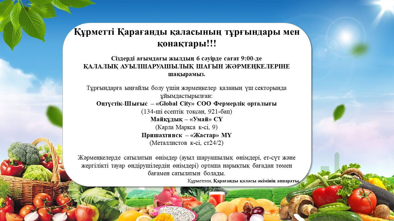 Қарағанды тұрғындары үшін 6 сәуірде қалалық ауылшаруашылық жәрмеңкелер ұйымдастырылады. Жергілікті тауар өндірушілердің өнімдерін қаланың үш нүктесінде сатып алуға болады.