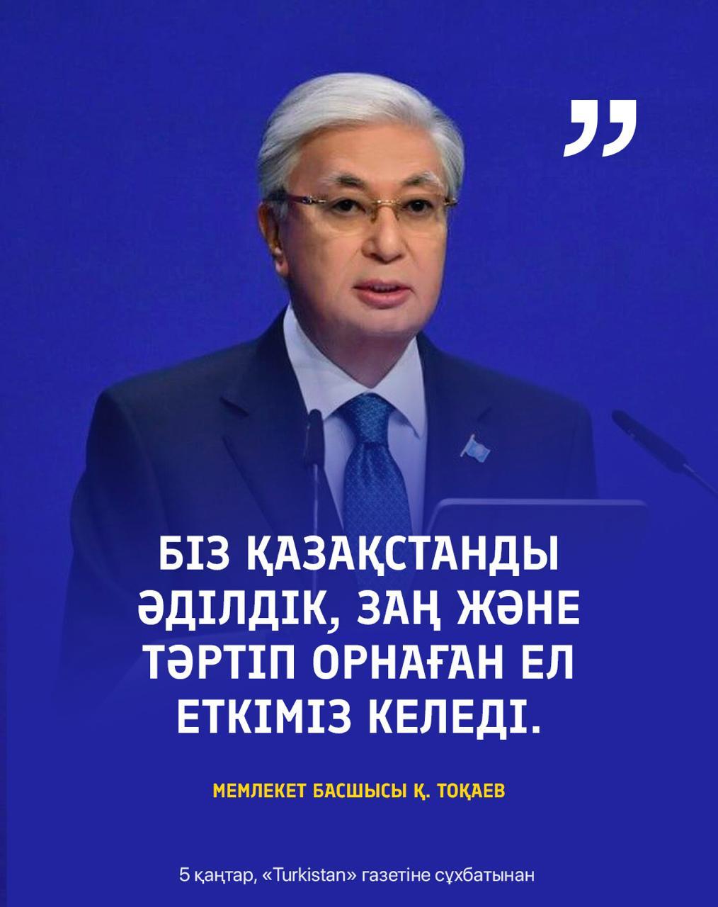 Әділдік – қоғамдағы тұрақтылықтың кепілі. Контситуцияға сәйкес, әр азамат заң алдында тең. Заң бәріне ортақ әрі бұлжымай орындалған жерде жемқорлыққа, жауапсыздыққа, тәртіпсіздікке жол жоқ.Президент Қасым-Жомарт Тоқаевтың «Біз Қазақстанды әділдік, заң және тәртіп орнаған ел еткіміз келеді» деген сөзі ел дамуының негізгі бағдары мен басты құндылықтарын айқындайды. Президент атап өткендей, әділдікке негізделген, заң мен тәртіп берік орнаған мемлекет қана өркендейді. Сондықтан бұл қағидалар Қазақстанның жаңа дәуірдегі дамуының темірқазығы болып, халқымыздың бірлігі мен игілігіне қызмет етеді