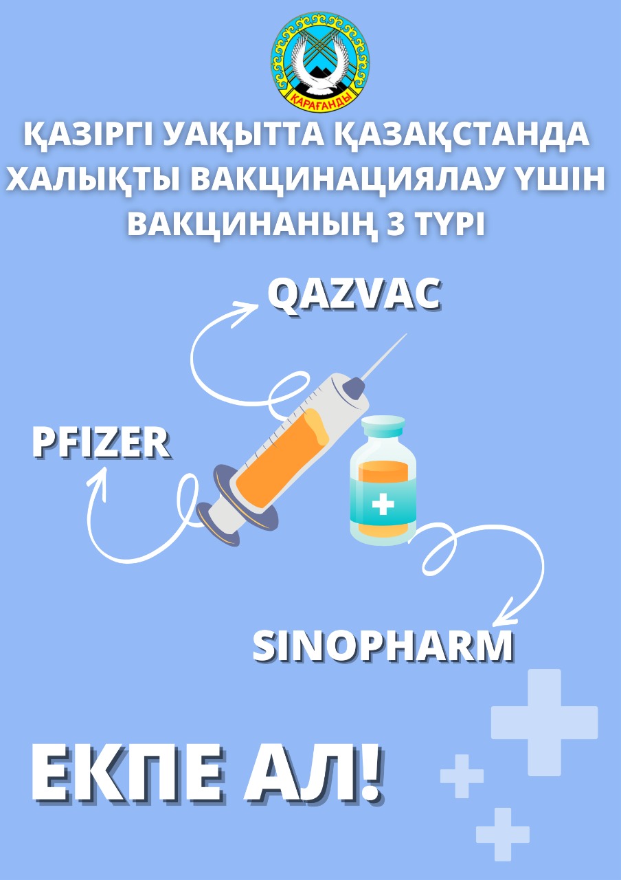 Екпе ал 03.08.2022 Оқылды: 325 Қазіргі уақытта Қазақстанда халықты вакцинациялау үшін вакциналардың 3 түрі — QazVac, Sinopharm, қайта вакцинациялау және ревакцинациялау үшін — QazVac, Sinopharm қолжетімді.