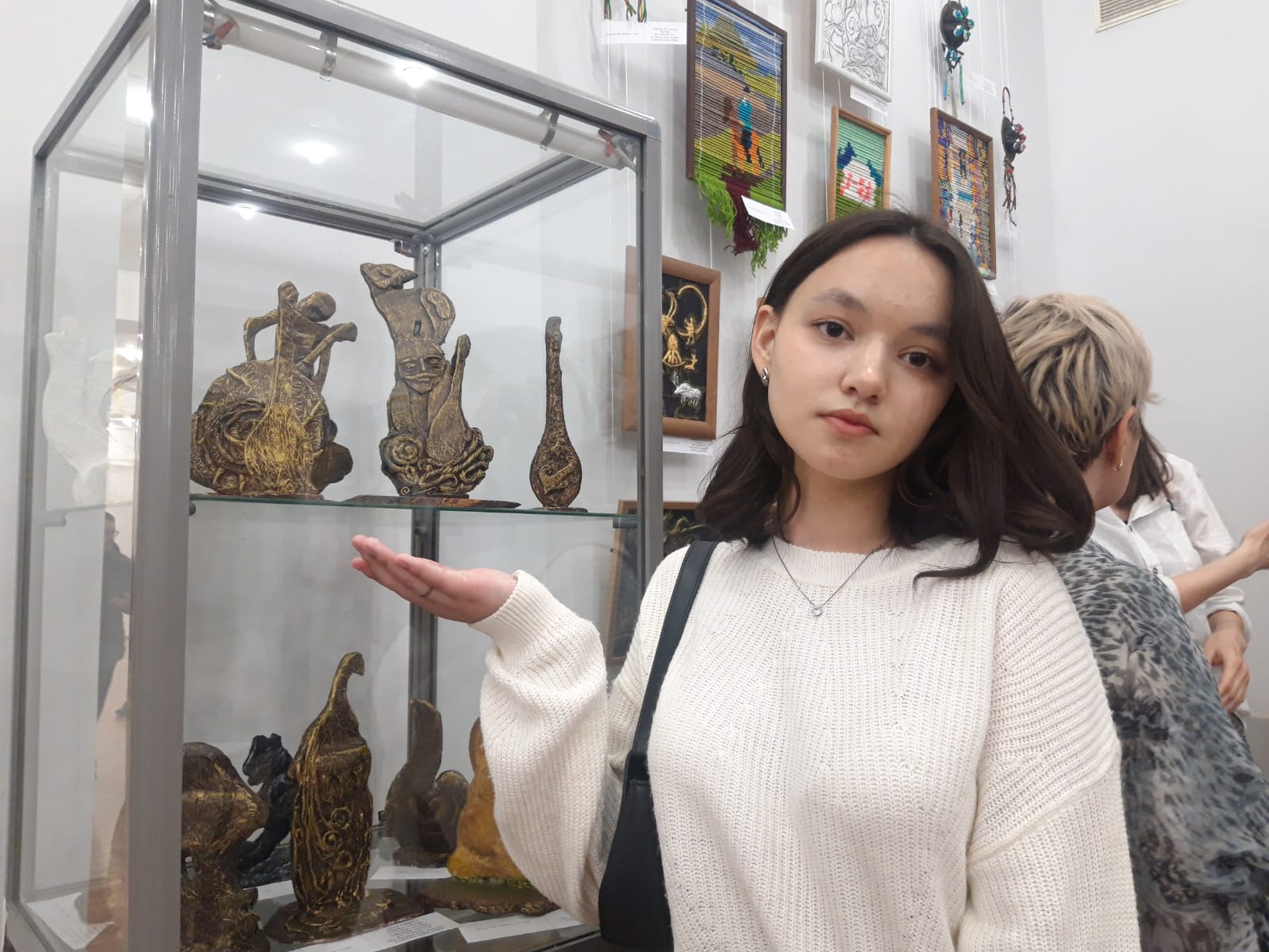 Он бес жастағы Фатима №1 балалар өнер мектебінің Бейнелеу өнері бөліміне 7-сыныпта келген екен, қазір ол 4-курсты тәмамдап жатыр. Бұрын көбіне сурет салса, бұл жолы өзін басқа бағытта сынап көрейін деп сәндік-қолданбалы өнер бағытын таңдап, көрмеге арнап үйтұмар жасаған екен.