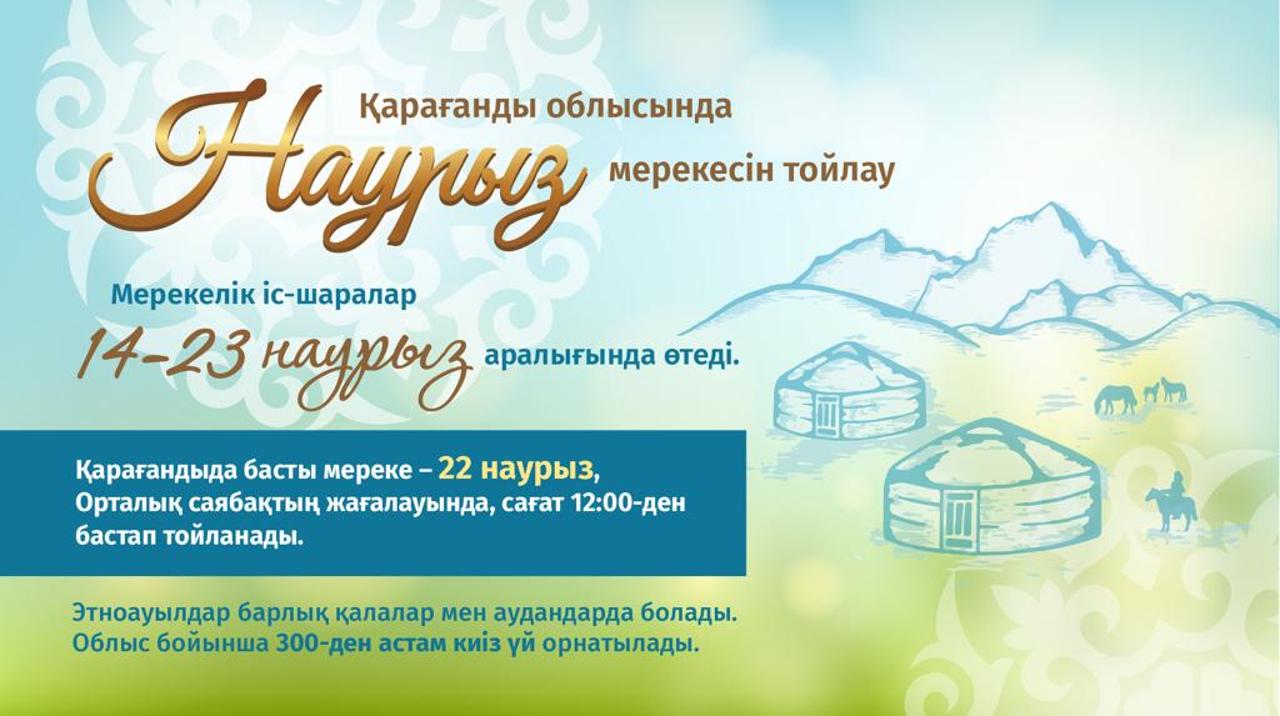 Қарағанды облысында Наурыз мейрамына орай ауқымды бағдарлама дайындалды. Мерекелік шаралар 14 наурызда басталып, 23-іне дейін жалғасады. Концерттер мен мерекелік кештер ғана емес, экологиялық және қайырымдылық акциялар да болады.