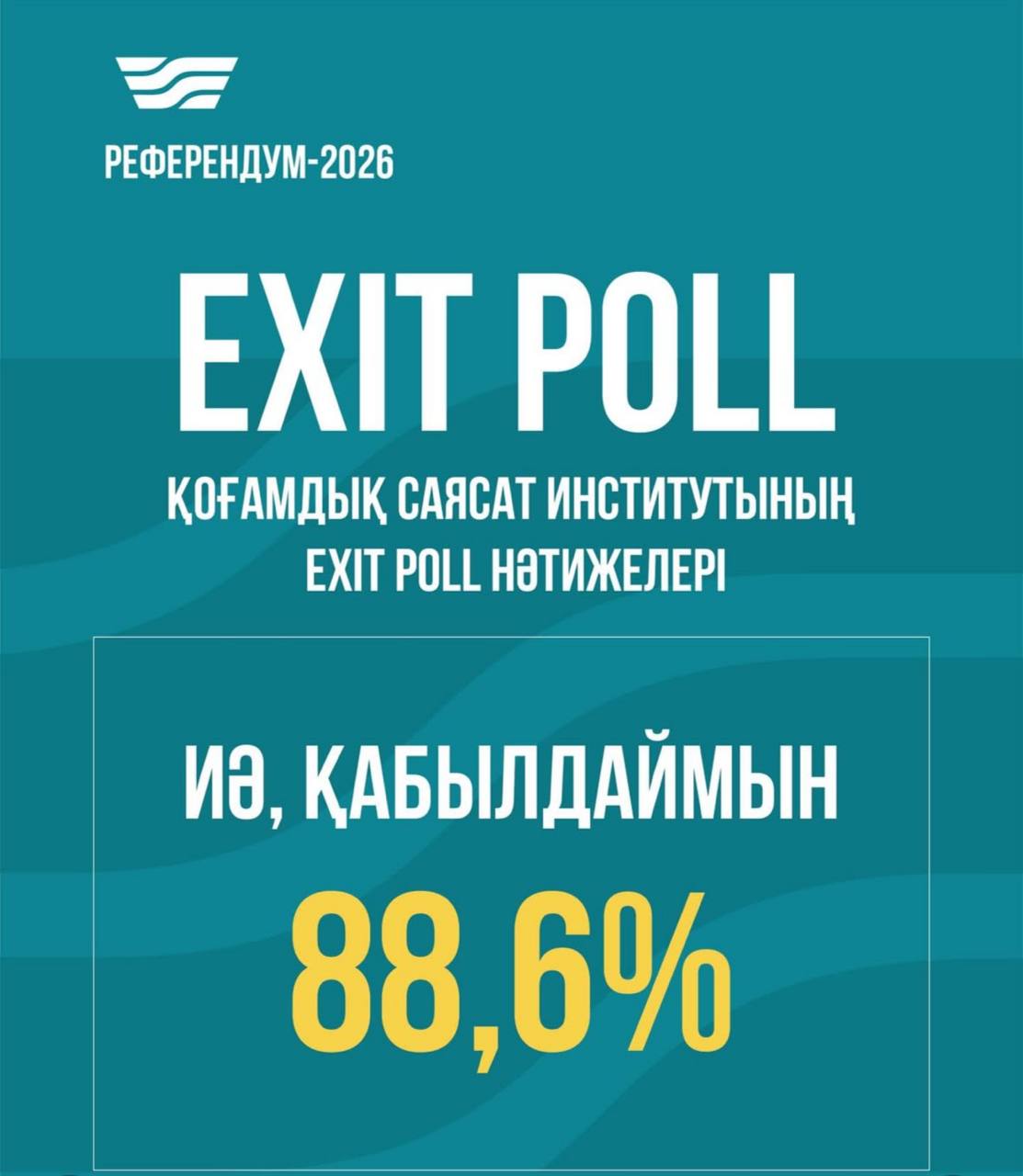 Қоғамдық саясат институтының Exit poll нәтижесі 16.03.2026 Оқылды: 15 Сауалнамаға 24 мың азамат қатысты. Опрос 200 сайлау учаскесін қамтыды. Сауалнама нәтижесі бойынша: 88,6% қатысушылар жаңа Конституцияны қолдады («иә» деп дауыс берді) Референдумға қатысу деңгейі — 72,1%