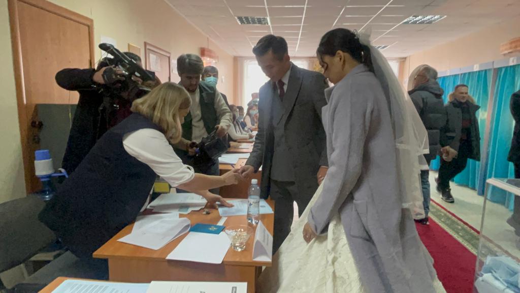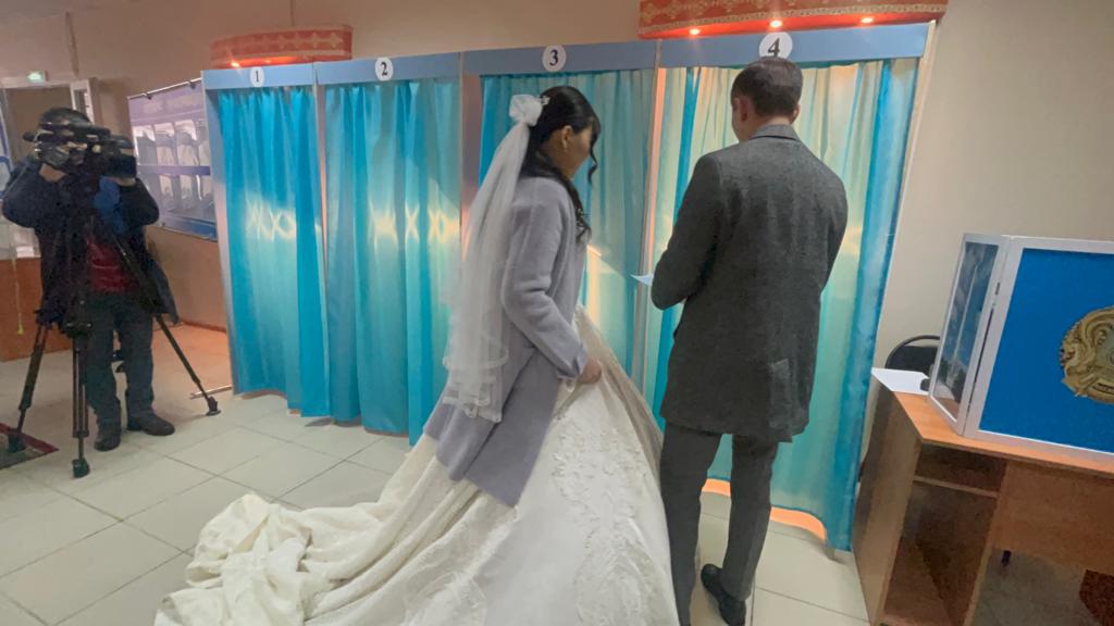 Қазақстанның болашағы үшін дауыс беруге бүгін ғана некесін қидырып, отау құрған жас жұбайлар Карибай Алтынбек пен Алимханова Гулбаршын №82 сайлау учаскесіне келді.
