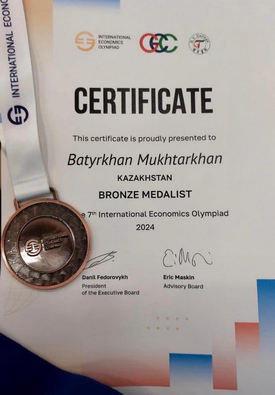 Қарағандыдағы Назарбаев зияткерлік мектебінің тоғызыншы сынып оқушысы Батырхан Мұхтархан Гонконгта өткен IEO-2024 халықаралық экономика олимпиадасына қатысып, қола медаль жеңіп алды. Зияткерлік жарыста әлемнің 53 елінен 250 оқушы бақ сынады.