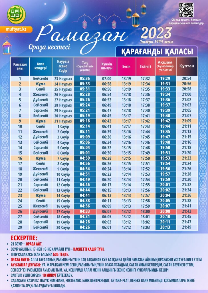 Биыл Рамазан айының бірінші күні 23 наурызға тура келеді. Ораза 29 күн. Ал сәуір айының 17-сінен 18-іне қараған түн – Қасиетті Қадір түні. Бұл туралы Қазақстан мұсылмандары діни басқармасының төрағасы Наурызбай қажы Тағанұлы айтты.