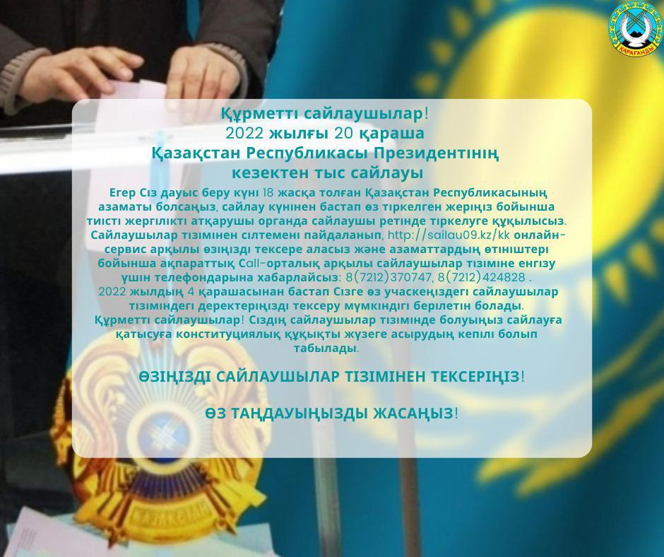 Құрметті сайлаушылар! Сіздің сайлаушылар тізімінде болуыңыз сайлауға қатысуға конституциялық құқықты жүзеге асырудың кепілі болып табылады.