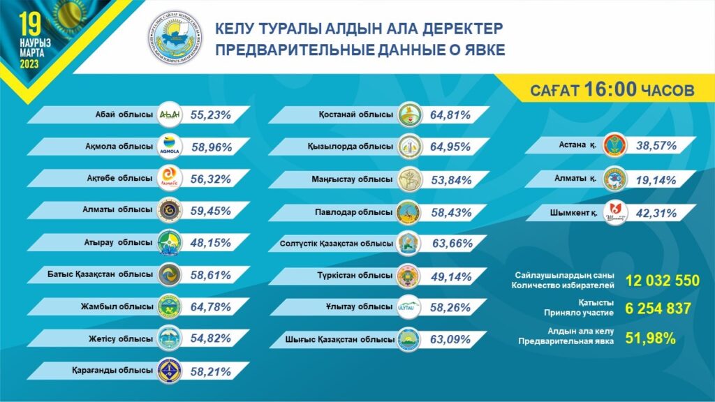 Облыстардың, республикалық маңызы бар қалалардың, елорданың комиссиялары ұсынған деректерге сәйкес, 2023 жылғы 19 наурызда сағат 16.10-дағы жағдай бойынша тізімдерге енгізілген азаматтардың жалпы санының 51,98 % бюллетеньдер алды.