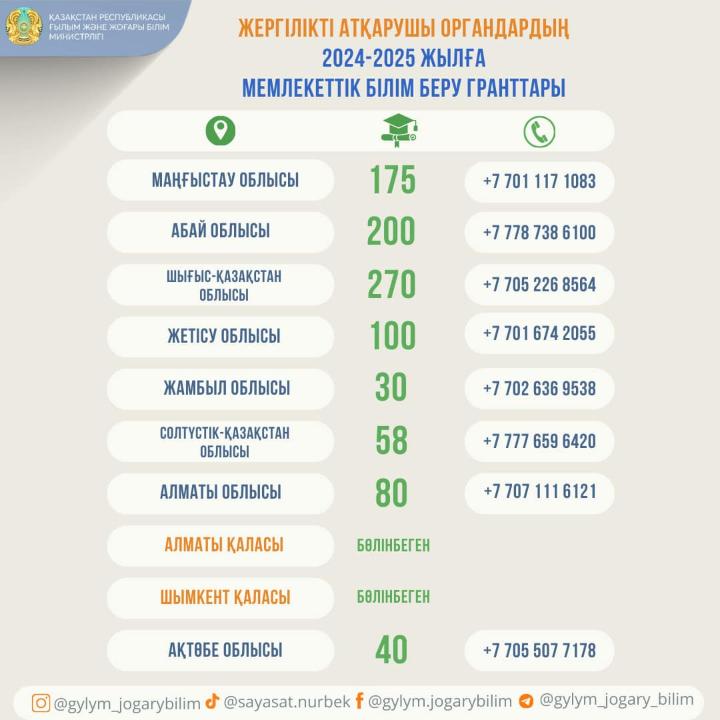 -2024-2025 оқу жылына жергілікті атқарушы органдардан конкурстық негізде мемлекеттік білім беру грантына өтініштерді қабылдау басталды. Әкімдіктер жыл сайын басым мамандықтар бойынша нысаналы даярлыққа гранттар бөледі. Биыл жергілікті атқарушы органдар 2475 білім беру гранттарын бөлді, -делінген ведомствоның хабарламасында.