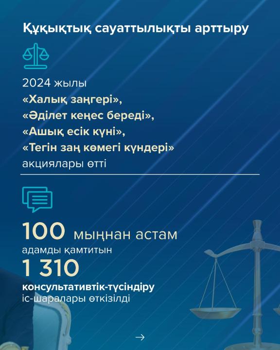 Мәселен, 2024 жылы «Халық заңгері», «Әділет кеңес береді», «Ашық есік күні», «Тегін заң көмегі күндері» акциялары іске қосылды. Өткен жылы республиканың барлық өңірлерінде жалпы саны 100 000 мыңнан астам адамды қамтитын 1 310 консультативтік-түсіндіру іс-шаралары өткізілді.