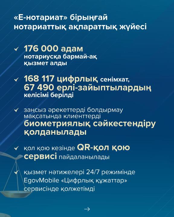 Бұдан бөлек, заңсыз әрекеттердің алдын алу мақсатында клиенттерді биометриялық сәйкестендіру қолданылады, өтініштерге қол қою кезінде QR-қол қою сервисі қолданылып, қызмет нәтижелері 24/7 режимінде EgovMobile «Цифрлық құжаттар» сервисінде қолжетімді. Осылайша, осы қызмет арқылы Қазақстан азаматтары нотариусқа бармай-ақ 168 мыңға жуық сенімхат пен ерлі-зайыптылардың 67,5 мың. келісімін заңды түрде ресімдей алды.