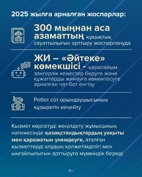 - 2025 жылы 300 мыңнан астам азаматты құқықтық сауаттылығын оқыту жоспарлануда;
