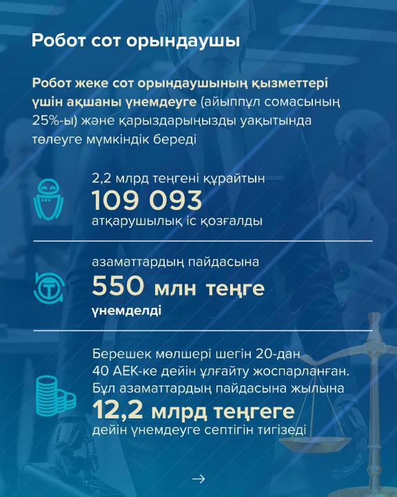 Тағы бір маңызды жетістік – «Сот орындаушысы роботын» енгізу болып табылады. Мәселен, 20 АЕК-ке дейінгі әкімшілік айыппұлдар уақытылы төленбеген жағдайда уәкілетті орган мәліметтерді жеке сот орындаушының қатысуынсыз іс жүргізуді қозғайтын Робот сот орындаушысына береді. Іс қозғалғаннан кейін азаматтар іс туралы егжей-тегжейлі ақпараты бар EGov Mobile-да 1414-тен SMS хабарлама және push-хабарлама алады, сол арқылы азаматтар айыппұл сомасының 25% қосымша төлеуден және сот орындаушысына барудан босатылады, өйткені барлық әрекеттер онлайн режимінде жүргізіледі.