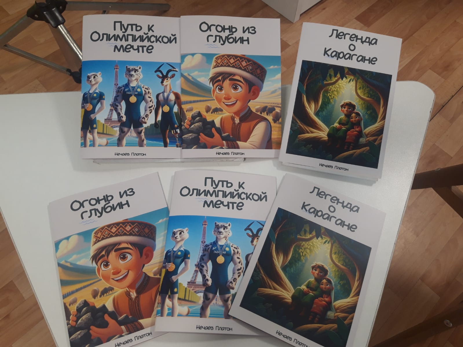 – Кітаптарым Аппақ Байжанов, қараған өсімдігі, Олимпиада ойындары туралы. Қала тарихын ешкім ұмытпауы үшін өз қалам туралы, мәселен, біздің қаланың неліктен Қарағанды аталатыны жөнінде жаздым. Барлық кітапты өзім жаздым, Аппақ Байжанов туралы жазғанда кітаптардағы тарихқа аздап сүйендім, басқа кітаптарда бәрін өзім ойлап таптым. Мен кітаптарымды бірнеше ай жаздым. Ең ұзақ жұмыс жасаған кітабым – «Олимпиялық арманға апарар жол», ол 60-тан астам беттен және 50-ге жуық суреттен тұрады. Басқа кітаптарда шамамен 30-40 бет бар. Кітап оқығанда бір ой келіп, өз оқиғамды жазамын. Суреттерді ЖЗ арқылы таңдаймын, бірақ ол алғашында дұрыс шықпайды, оған әр кейіпкердің нақты сипаттамасы қажет. Мен Canva, AI Image Generator сияқты қолданбаларды пайдаланамын. Бірінші кітапты жасауға анам көмектесті, кейін қалғанын өзім жасадым, мәтінді өзім ойлап тауып жаздым. Болашақта Қазақстанның әр аймағы туралы осындай кітаптар шығарғым келеді, ол үшін алдымен олардың тарихын зерттеу керек, – дейді жас қаламгер Платон Нечаев.