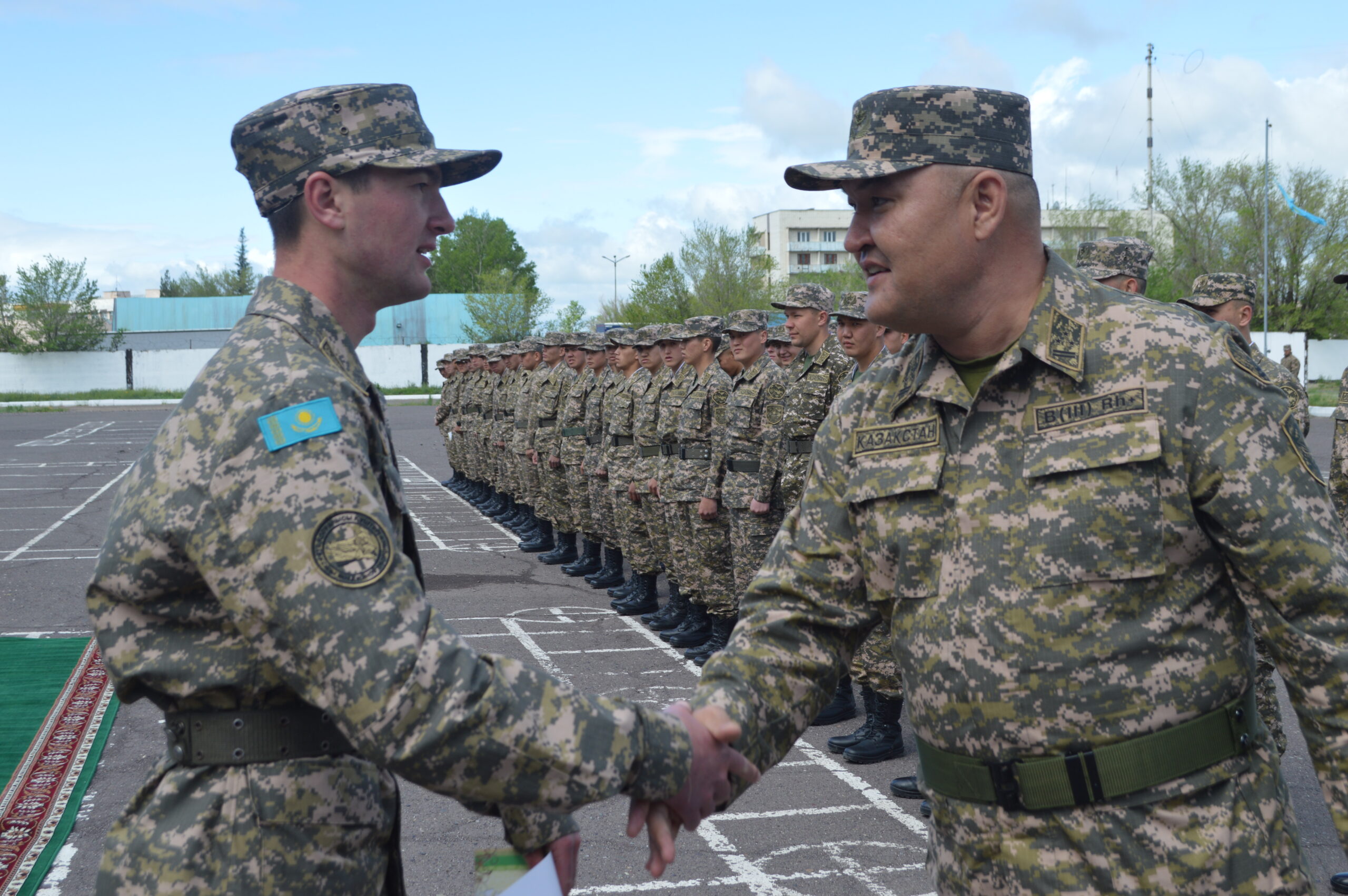 Бөлімнің барлық жеке құрамы саптық алаңда жиналып, қызмет еткен жігіттерге көпке үлгі болғаны үшін «алғыс» айтты. Осыдан кейін, Ту ұстаушы тобы мен құрметті қарауыл взводы саптық алаңға бөлімнің жауынгерлік туын алып шықты. Борышын атқарған жігіттер әріптестерімен қимай қоштасты. Жауынгерлер соңғы саптық қадамдарын жасап, құжаттарын, грамоталары мен мінездемелерін алып, офицерлермен қол алысты. Әскери қызмет тәрбиеледі деген сарбаздар, кәсіби маман ретінде де үлкен тәжірибе алған.