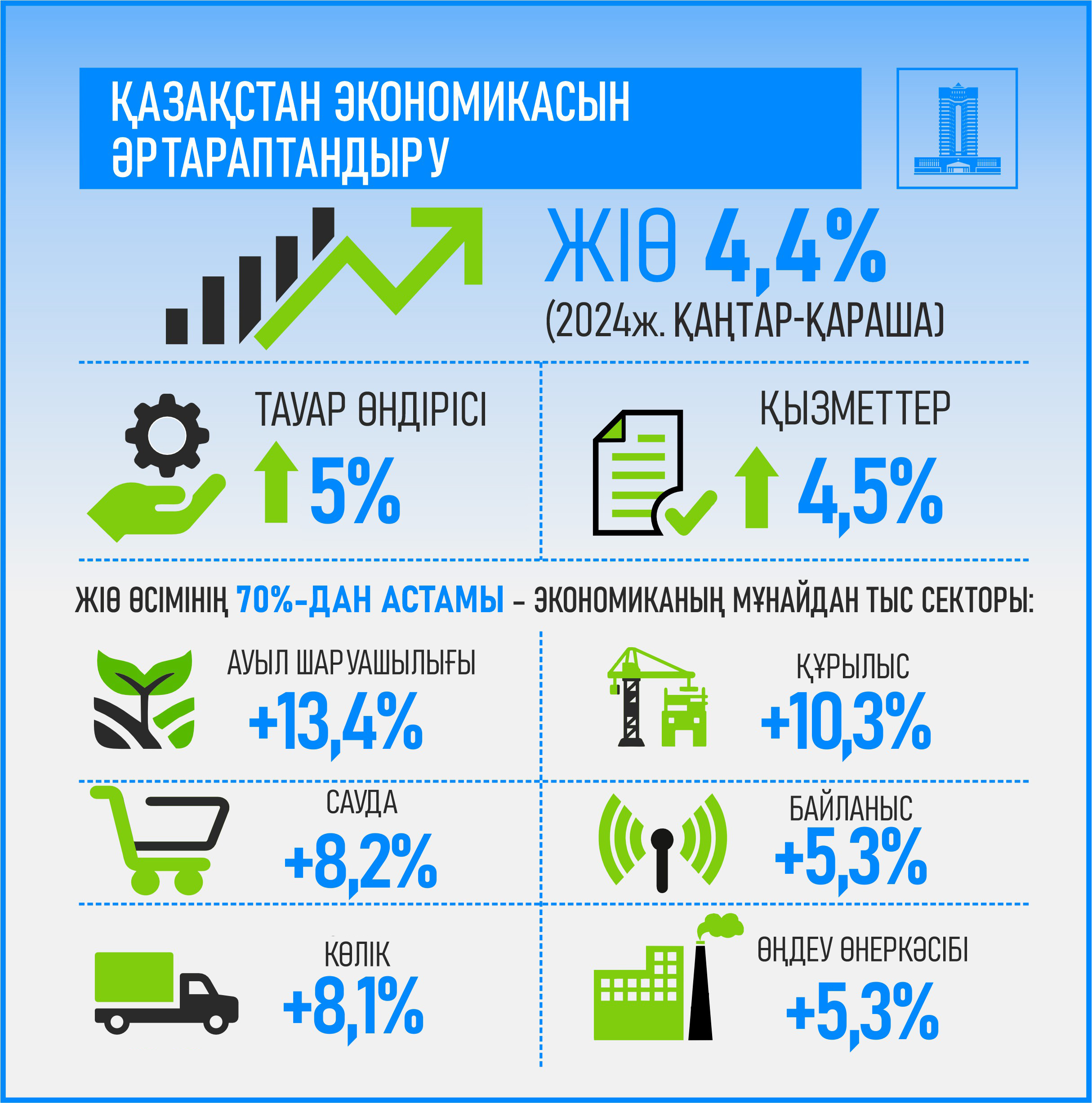 Алдын ала бағалау бойынша осы жылдың 11 айының қорытындысы бойынша ЖІӨ өсімі 4,4%-ды құрады, ол негізінен мұнайдан тыс секторды дамытумен қамтамасыз етілген. Экономика өсімінің 70%-дан астамы өңдеу өнеркәсібі, сауда, ауыл шаруашылығы және құрылыс есебінен қалыптасты. Салалар бөлінісінде келесідей динамика байқалады: ауыл шаруашылығында жалпы өнім шығарудың 13,4%-ға өсуі байқалды, бұл 2011 жылдан бергі ең жоғары көрсеткіш саналады; құрылыста – 10,3%; саудада – 8,2%; көлік қызметтерінде – 8,1%; байланыста – 5,3%; өңдеу өнеркәсібінде – 5,3%. Жалпы, аталған кезеңде отандық тауарлар өндірісі 5%,-ға, көрсетілген қызметтер 4,5%-ға өсті. Негізгі капиталға салынған инвестициялар көлемі 3,1%-ға артып, 15,8 трлн теңгеге жетті.