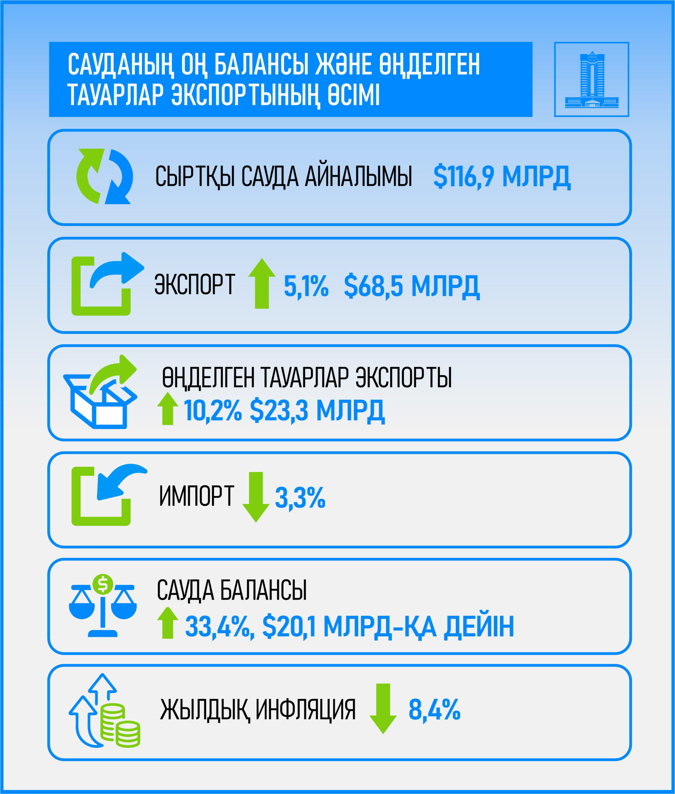 Сыртқы сауда айналымы биылғы 10 айда $116,9 млрд-ты құрады. Қазақстандық тауарлардың экспорты 5,1%-ға өсті, ақшалай баламада көрсеткіш – $68,5 млрд. Бұл ретте өңделген тауарлардың экспорты 10,2%-ға ұлғайып, $23,3 млрд-қа жетті. Шикізаттық емес экспорттың тұрақты өсуі көбінесе қазақстандық тауарларды Қытай мен Түркияға жеткізу көлемінің артуымен, сондай-ақ Еуропа нарықтарындағы қатысудың кеңеюімен байланысты.