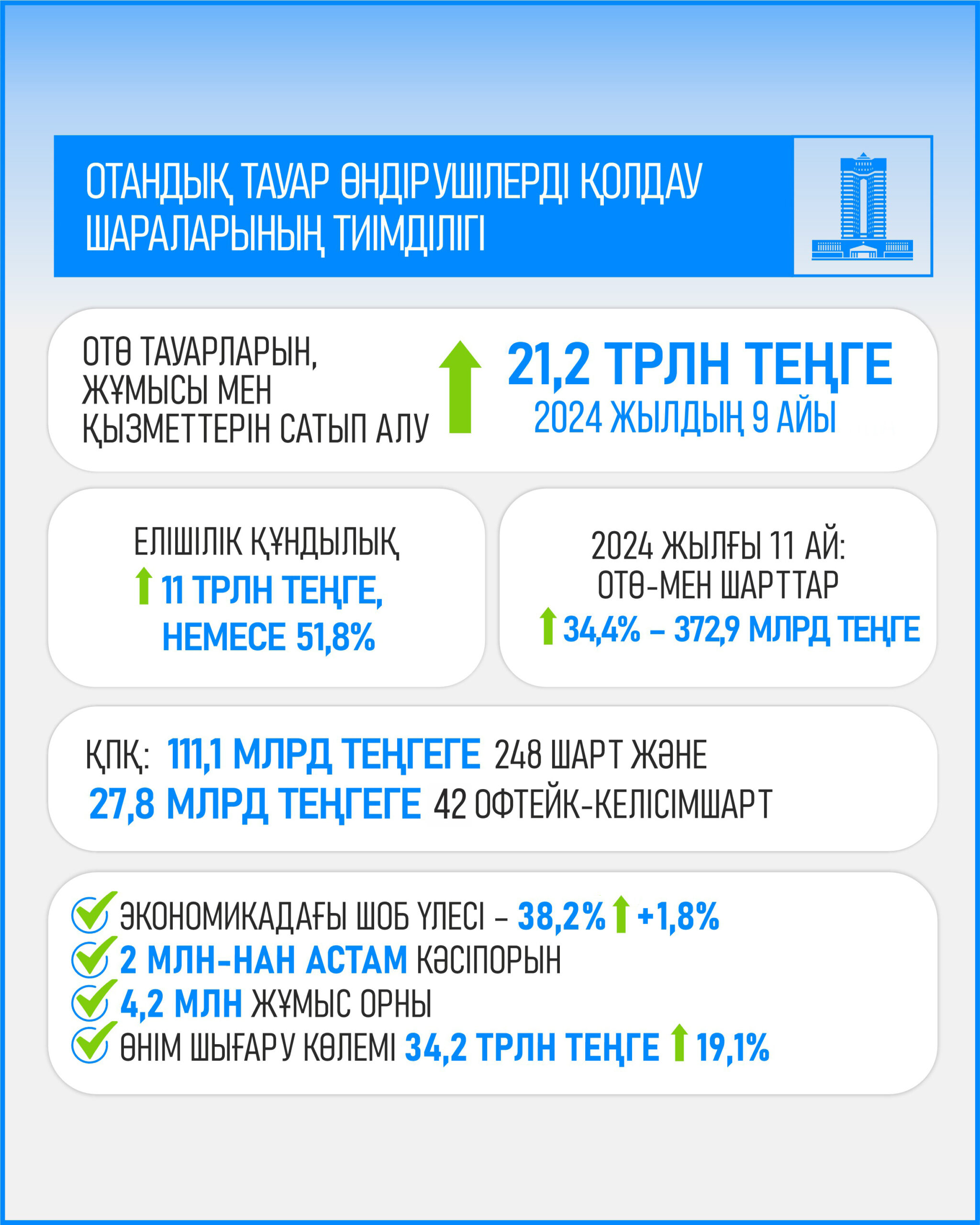 Отандық тауар өндірушілерді қолдаудың қабылданған шаралары экономикадағы шағын және орта бизнестің үлесін 1,8%-ға ұлғайтуға мүмкіндік берді және бүгінде ол 38,2%-ды құрайды. Осы жылдың 1 желтоқсанында жұмыс істеп тұрған ШОБ субъектілерінің саны 1,5%-ға артып, 2 млн кәсіпорыннан асты. Осы секторда барлығы 4,2 млн-нан астам қазақстандық жұмыспен қамтылды. Бұл ретте шағын және орта бизнес субъектілерінің өнім шығару көлемі 2024 жылдың 2 тоқсанында 19,1%-ға ұлғайып, 34,2 трлн теңгені құрады.